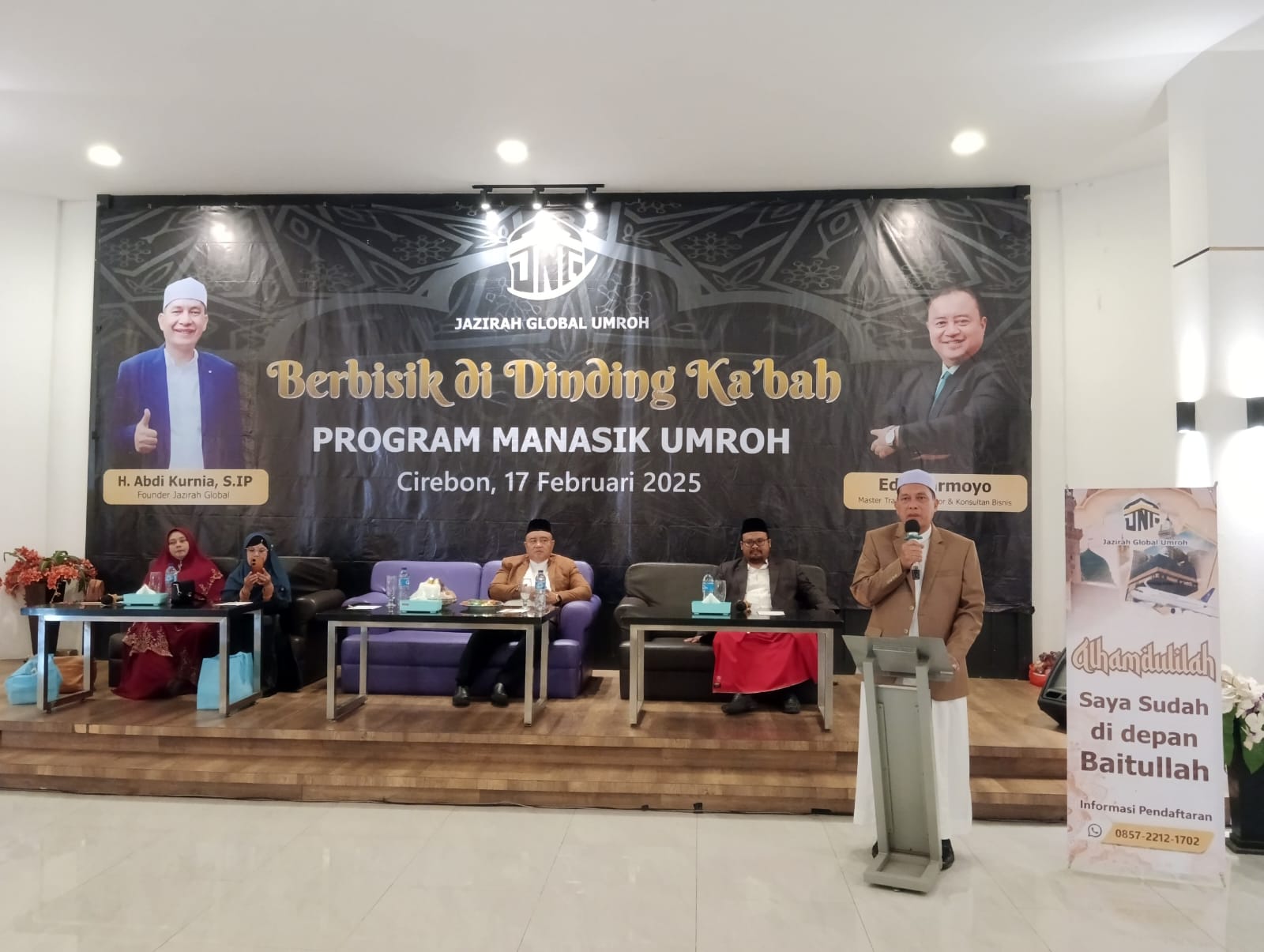 KOTA CIREBON.- PT Jazirah Nusantara Global menggelar Manasik Umrah bertajuk “Berbisik di Dinding Kabah”, Senin (17/2/2025), di Bandar Djakarta, Kota Cirebon.