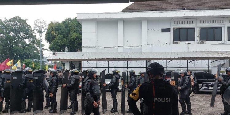 Mengantisipasi potensi gangguan keamanan, personel Batalyon C Pelopor Satbrimob Polda Jabar diterjunkan ke lokasi untuk melakukan pengamanan. Pasukan Brimob terlihat bersiaga di sekitar titik aksi guna memastikan demonstrasi berjalan kondusif.
