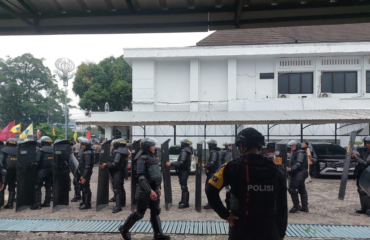 Mengantisipasi potensi gangguan keamanan, personel Batalyon C Pelopor Satbrimob Polda Jabar diterjunkan ke lokasi untuk melakukan pengamanan. Pasukan Brimob terlihat bersiaga di sekitar titik aksi guna memastikan demonstrasi berjalan kondusif.
