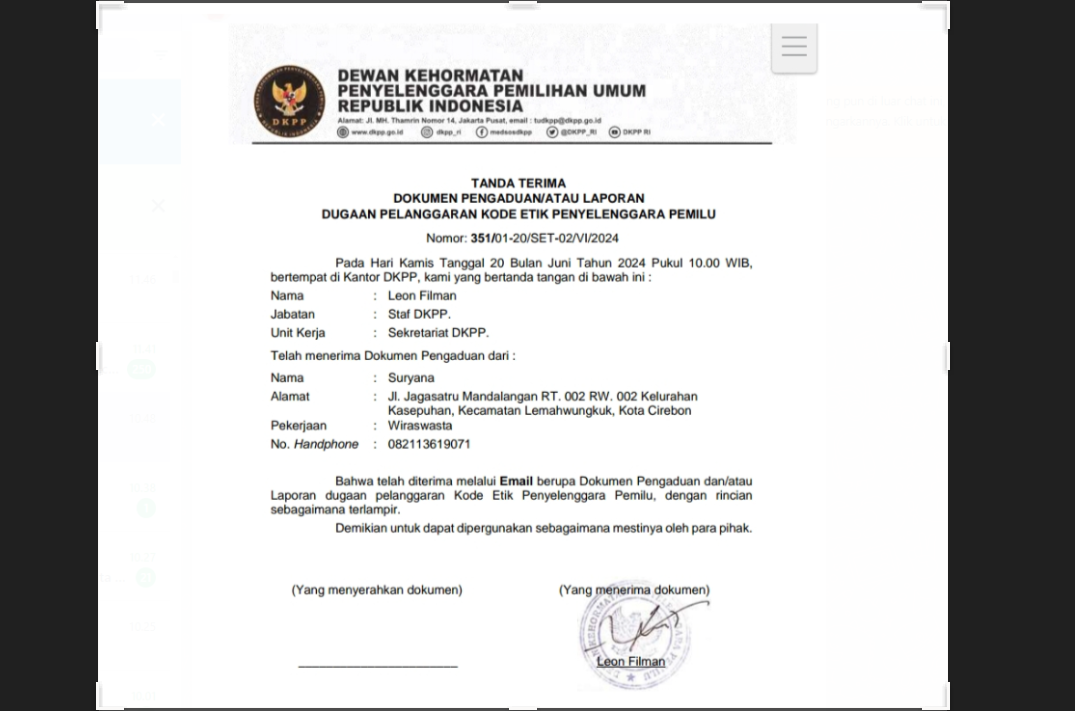 Suryana menambahkan laporan sudah diterima oleh staf DKPP, Leon Firman tanggal 20 Juni 2024 lalu.