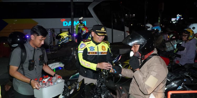 CIREBON.- Sebagai bentuk kepedulian terhadap para pemudik, Kapolres Cirebon Kota, AKBP Eko Iskandar, bersama jajarannya, turun langsung ke jalan untuk membagikan air mineral dan permen kepada pengendara roda dua yang melintas di depan Pos Pelayanan Terminal Harjamukti, Jumat (28/3/2025) malam.
