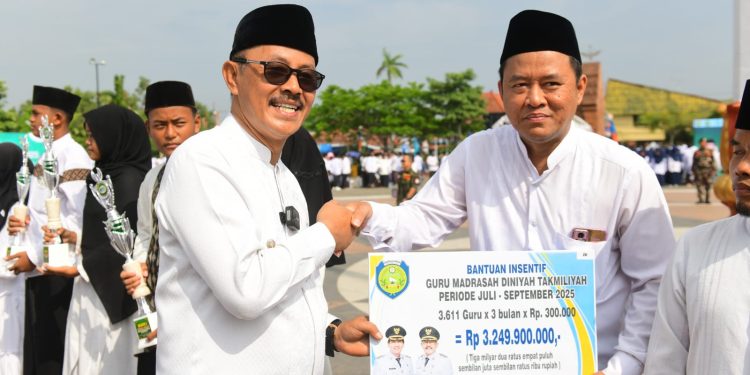 INDRAMAYU, – Dalam rangka Peringatan Hari Santri Nasional (HSN) Tahun 2025, Pemkab Indramayu menggelar Apel Hari Santri Nasional di Alun-Alun Indramayu pada Rabu (22/10/2025). Acara tersebut dihadiri oleh Wakil Bupati Indramayu, beserta jajaran Forum Koordinasi Pimpinan Daerah (Forkopimda), Kepala Kantor Kementerian Agama Kabupaten Indramayu, para kiai, pimpinan pondok pesantren, santri, serta pelajar madrasah.